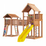 Игровая площадка изготовлена из клееного соснового бруса и массива сосны .Дерево обработано безопасной декоративно-защитной пропиткой. Технология значительно увеличивает срок службы конструкций, повышает прочность древесины, защищает её от гниения и грибков.